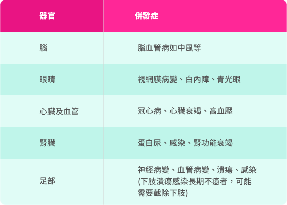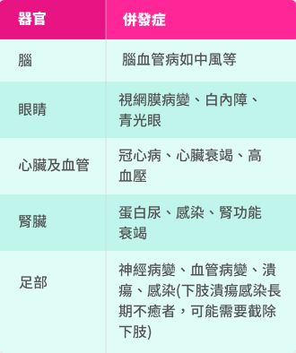 - 糖尿病會令因吸煙、高血壓及高血脂導致的心血管損傷雪上加霜,對身體器官及系統造成更進一步的破壞。